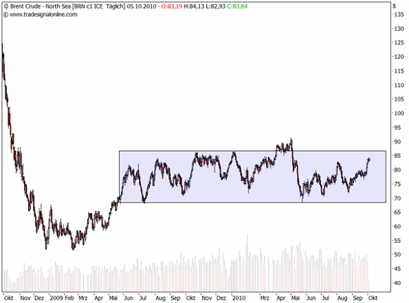 Unter anderem aufgrund der Dollarschwäche befinden sich einige Rohstoffe seit Wochen in einem Aufwärtstrend. Und auch der Ölpreis könnte bald aus seiner Seitwärtsbewegung, die seit Mai dieses Jahres besteht, nach oben ausbrechen. Er ist, wie die meisten Rohstoffe, in Dollar gelistet. Das bedeutet: Wenn der Dollar seinen Abwärtstrend fortsetzt, der sich in den letzten Wochen beschleunigt hat, wird der Ölpreis immer weiter steigen. Es könnte somit eine erneute Ölpreisrally starten, die letzten Endes lediglich Abbild eines immer schwächeren Dollars wäre.